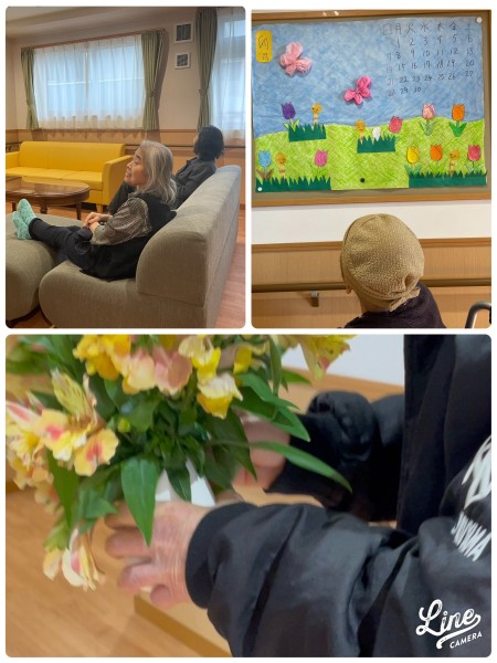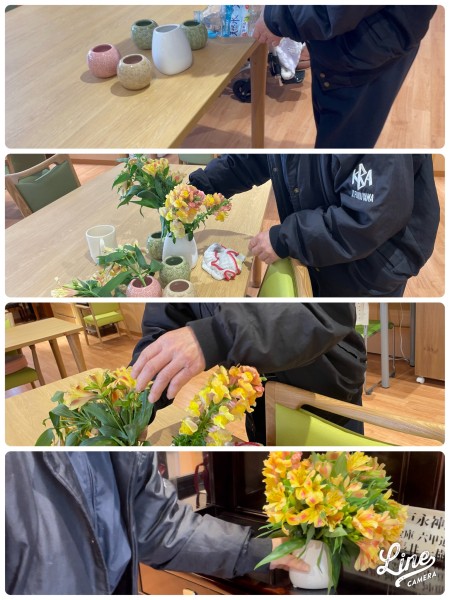 今日はお世話になっているケアマネジャーさんからとても綺麗なお花を頂きましたので利用者様と一緒にセットしました。又、各階皆様穏やかにお過ごしいただいています。