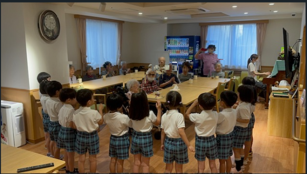 永神館の隣の、ゆたか幼稚園のお子様5歳児の皆さんがお歌を披露しに来てくれました。”トンボのメガネ”や”虫の声”を合唱してくれました。子ども達が歌う姿を真剣に聴き、微笑ましそうな様子で手拍子をしながら聴いてくださっていました♬♪